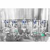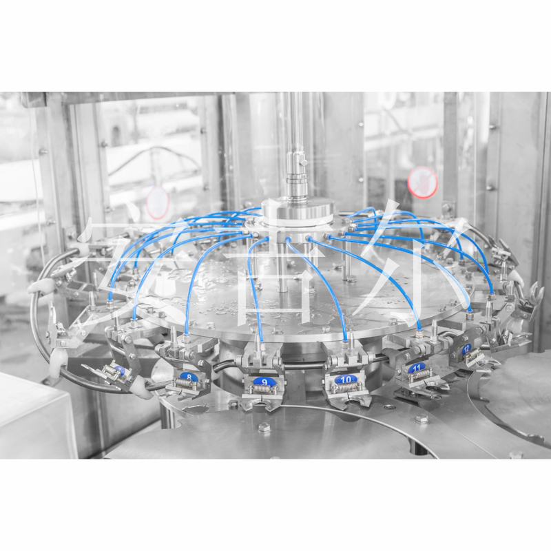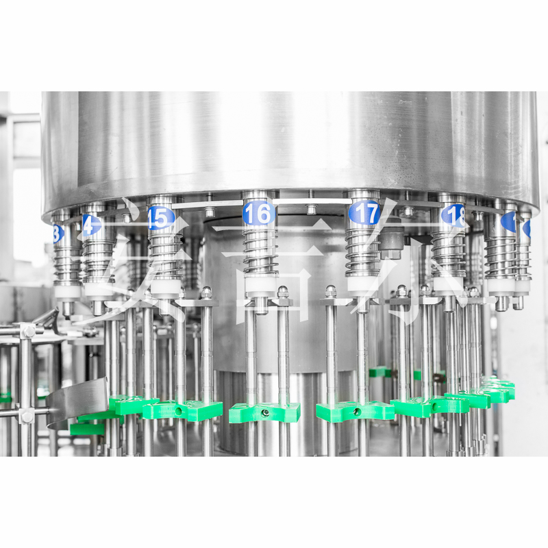 XG18-18-6三合一灌裝機主要用于礦泉水、純凈水的灌裝作業。本機將沖洗、灌裝、旋蓋三功能合在一個機體上,全過程實現自動化。本機適用于聚酯瓶、塑料瓶,各部分的適用瓶型調整采用手柄轉動實現,輕松自如,簡便快捷。灌裝方式采用了新型的常壓灌裝,使灌裝速度更快更穩定,所以與同規格的機器相比本機的產 量更高,效益更大。本機采用了先進的可編程控制器(PLC)控制機器的自動運行,進瓶鏈道采用變頻器調整,與主機變頻器相互配合使進瓶運行更穩定可靠,光電檢測各部件的運行狀況。自動化程度高,操作簡便。是礦泉水、純凈水生產廠家理想的首先設備。